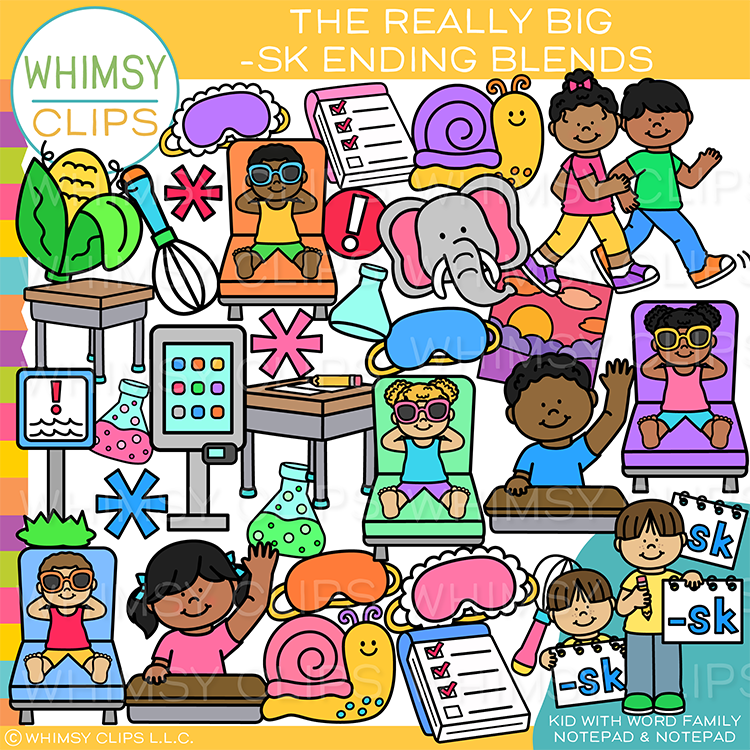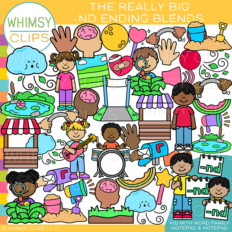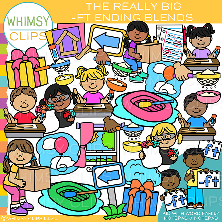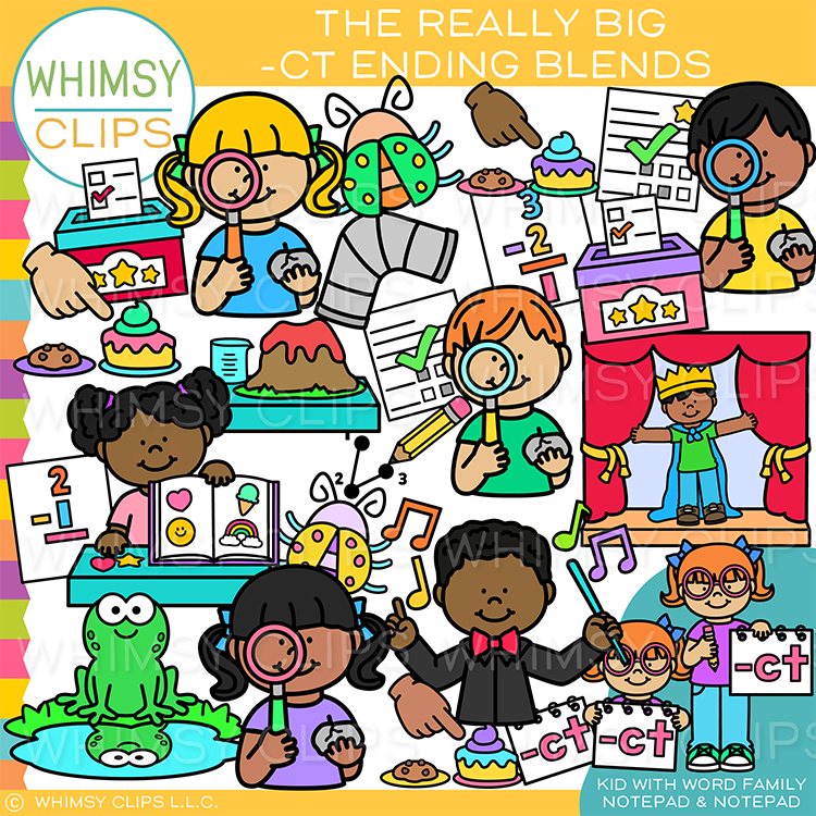 Each ending blend word family clip art set will also include a kid holding a pencil and notepad with lowercase digraph sound letters, a kid peeking over a notepad with the letters and a notepad with the letters.