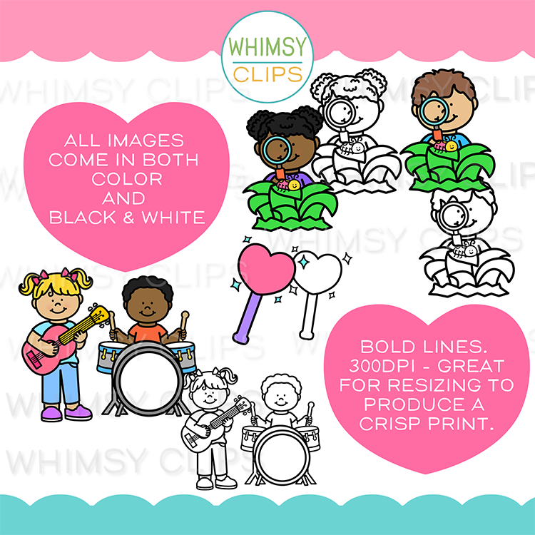 All images are transparent 300dpi png and come in both color and black & white. 300 dpi is the industry standard for printing. DPI means each image is made up of 300 dots per inch, so technically, if you size up or down, there are enough dots in each image to still produce a nice crisp print while retaining quality.