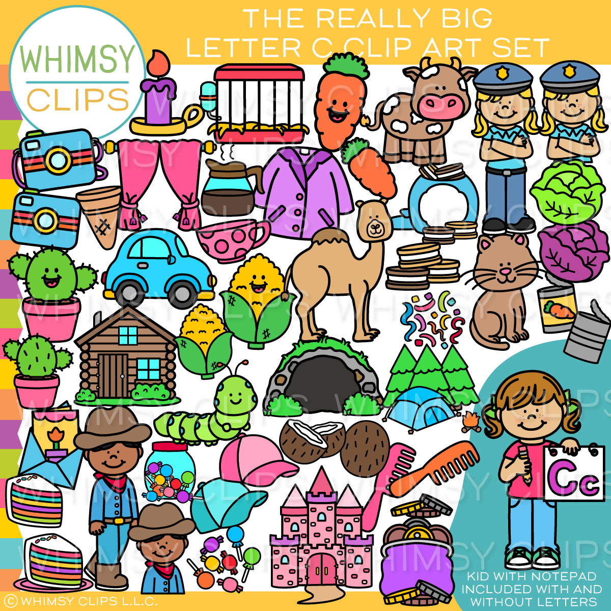 The Really Big Letter C clip art set is filled with fun and vibrant images with bold lines that illustrate the letter C and is part of the larger Really Big Alphabet Bundle. The set features 33 words and one kid holding a pencil and notepad with uppercase and lowercase letter C.