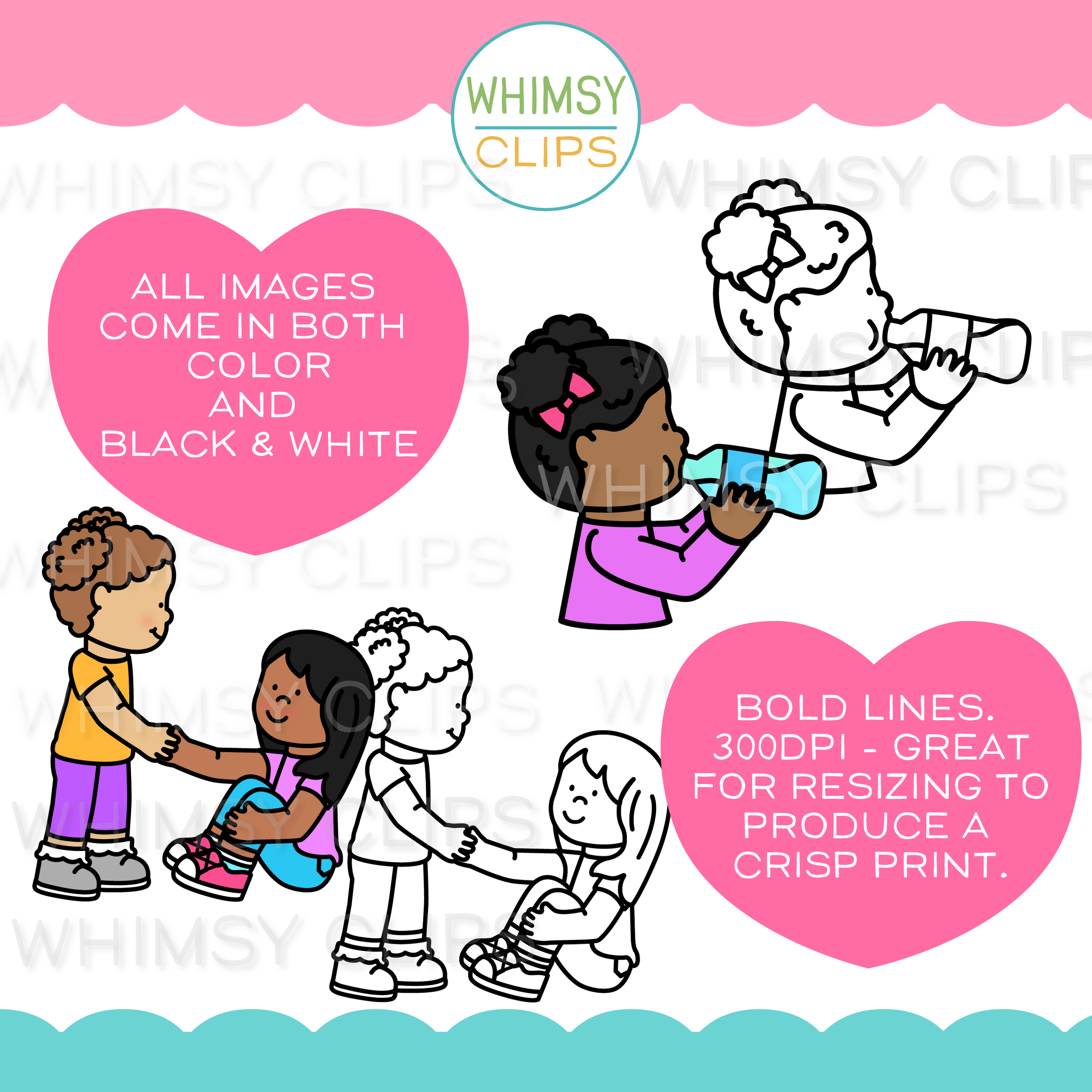 All images are transparent 300dpi png and come in both color and black & white. 300 dpi is the industry standard for printing. DPI means each image is made up of 300 dots per inch, so technically, if you size up or down, there are enough dots in each image to still produce a nice crisp print while retaining quality.