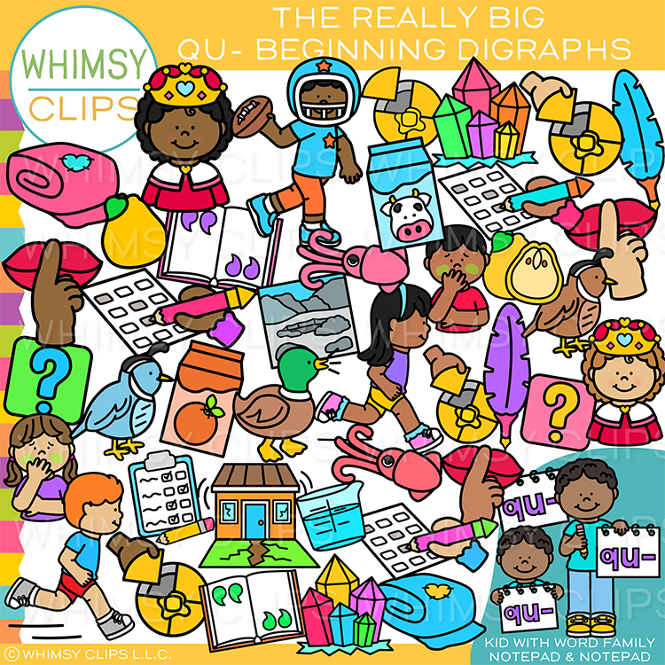 The Beginning Digraph Qu sound clip art set is packed with tons of images and options and contains 21 beginning Qu words. This set is part of The Really, Really Big Beginning Digraphs Bundle.