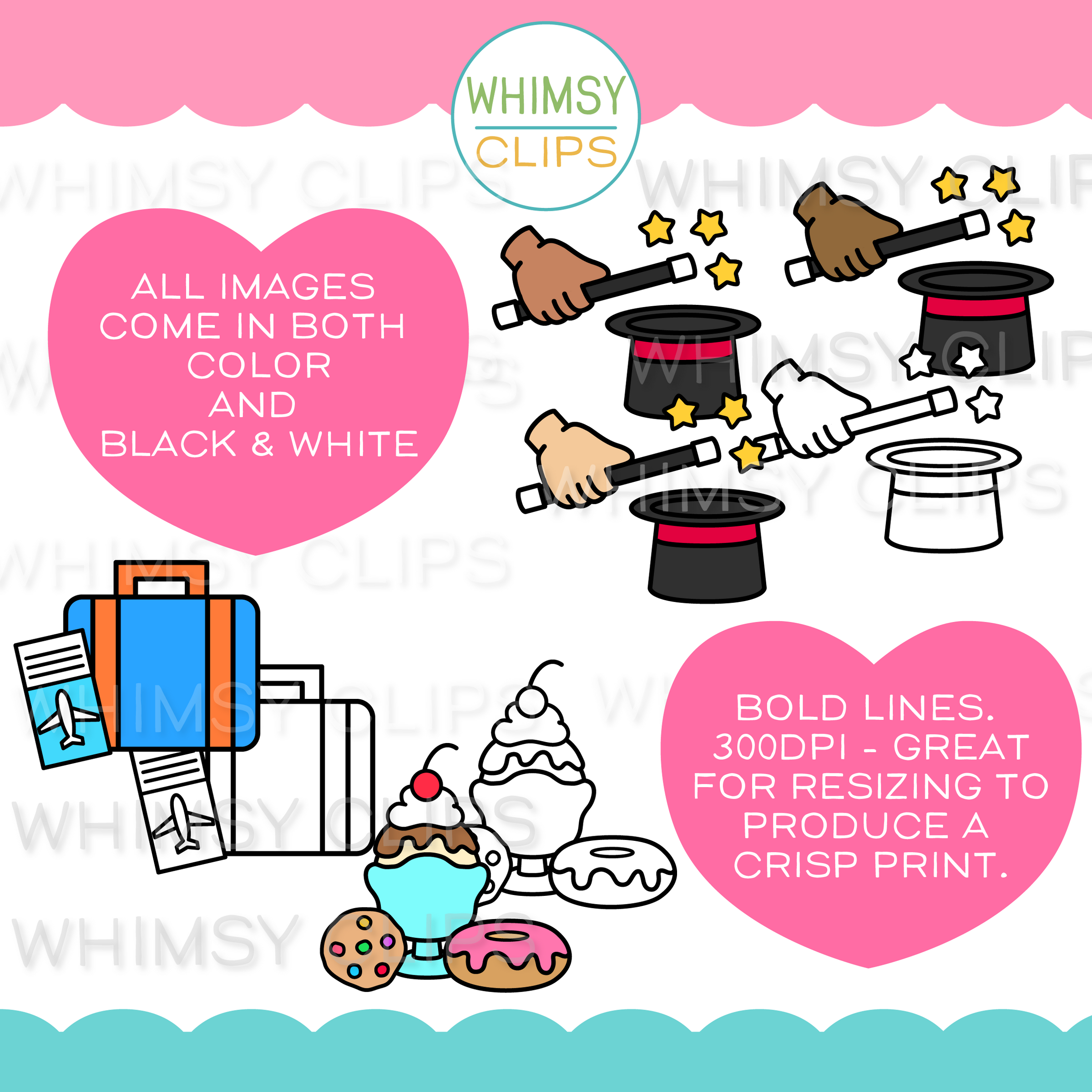 All images are transparent 300dpi png and come in both color and black & white. 300 dpi is the industry standard for printing. DPI means each image is made up of 300 dots per inch, so technically, if you size up or down, there are enough dots in each image to still produce a nice crisp print while retaining quality.